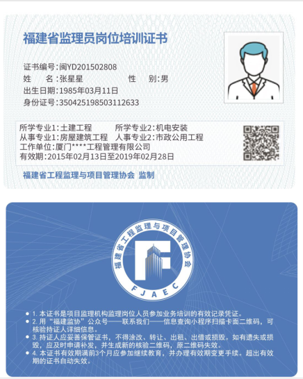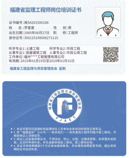 福建省监理工程师/监理员岗位培训证书编号说明